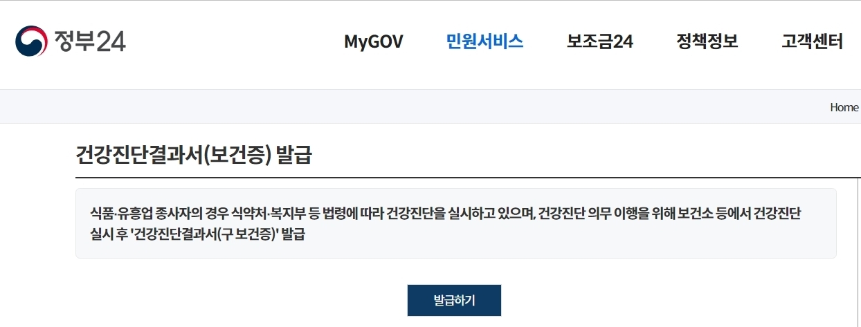 정부24는 공공문서 발급 대표 포털이라서, 보건증도 이곳에서 신청 가능하거든요. ‘건강진단결과서(구 보건증)’로 검색하면 바로 찾을 수 있어요.
